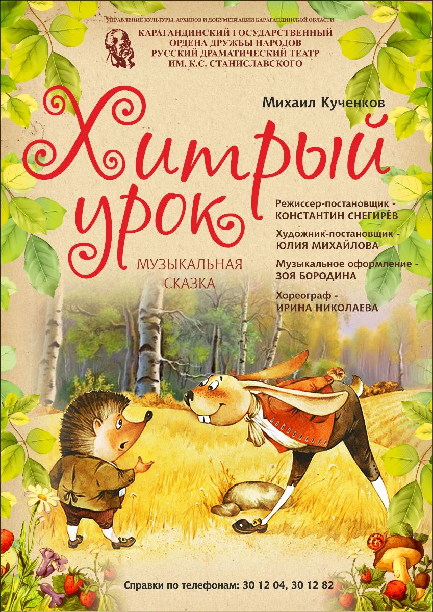 Весенняя не только потому, что ее действие разворачивается в зеленом лесу: постановка энергична и задорна, а у своих первых юных зрителей она оставила самые теплые впечатления. Спектакль «Хитрый урок» поставлен по пьесе современного российского драматурга Михаила Кученкова: это современная инсценировка сказки великих немецких авторов братьев Гримм.